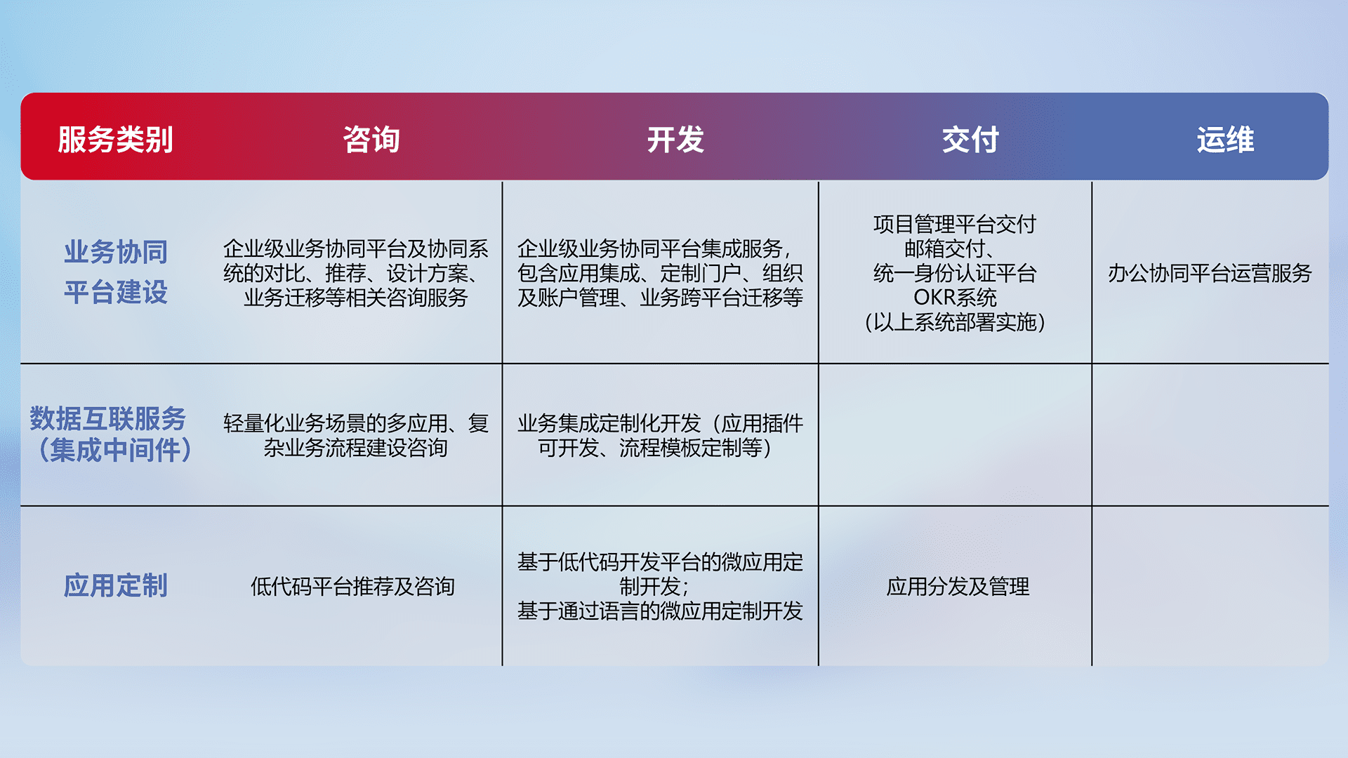 针对钉钉、、、企微、、、IDaas等平台级产品提供产品的规划、、方案、、交付、、、、定制化开发等服务,,,实现如统一协同办公、、、智能客户服务、、、、混合会议管理、、、智能数据查询、、、、等业务场景,,,实现数字化转型。。