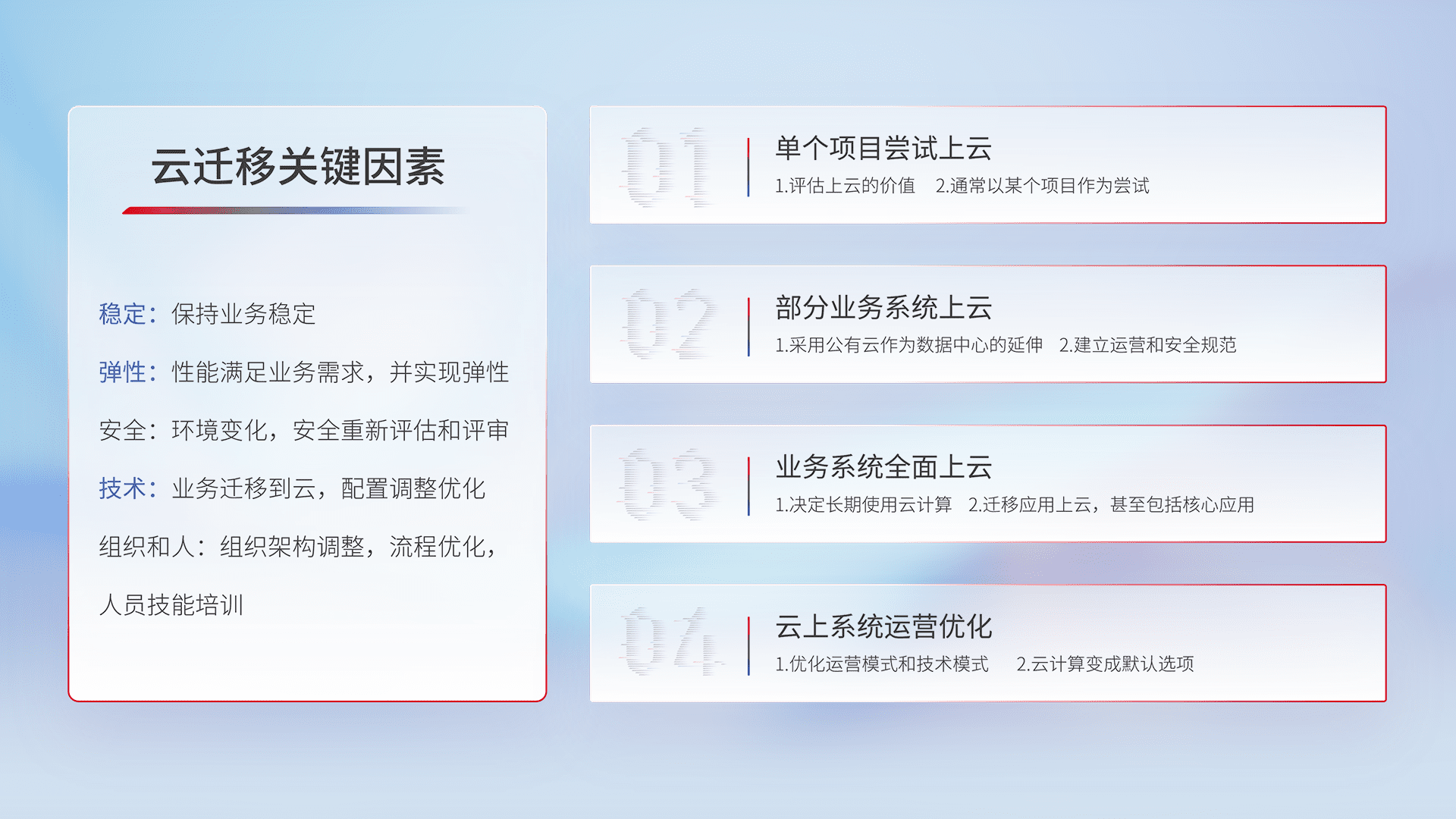 结合实际业务,,,从规划设计、、、、云平台选型、、、、云原生改造、、、、数据迁移、、集成交付,,迁移全过程为客户识别最佳上云路径,,,做好风险识别管理,,,,设计网络架构、、、身份权限、、、安全审计合规、、、、操作审计、、、日志审计、、、监控告警策略、、、、多站点容灾设计等,,,,对云上基础设施进行整体规划,,,,提升IT治理水平,,以满足弹性、、、高可用、、高性能的需求。。