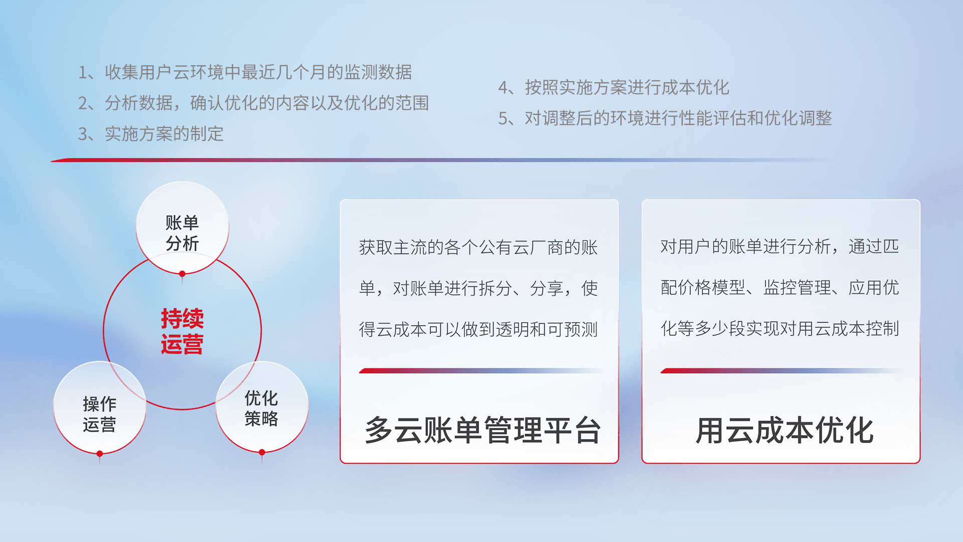 通过多云纳管,,,以统一的资源数据模型把客户的云资源进行抽象和封装,,,进而实现对多云资源的统一操作,,,,保障云资源管理的可靠性、、、、稳定性与可用性。。。。量身定制化运维内容,,配置、、、开发运维、、补丁管理、、、备份、、、监控、、、、认证和访问管理、、、审计和日常巡检等,,,,保障在用云过程中的可靠度,,稳定度以及高可用率。。。。
